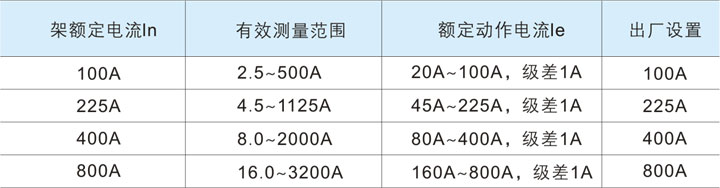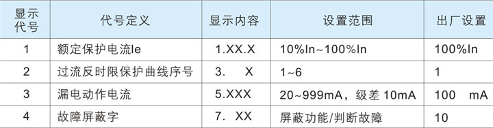 額定動作電流值可在上表中"額定保護電流le設置范圍"內(nèi)任意設置。