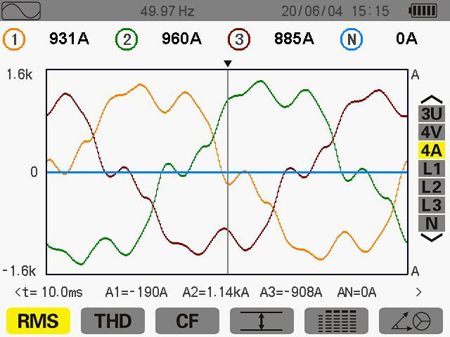 此次測量在其 ABC 電流分別為 427A 414A 435A 當(dāng)天生產(chǎn)使用其變壓器為60%,未滿負(fù)載運(yùn)行中。