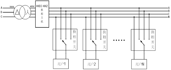 三相負荷不平衡自動調節(jié)裝置系統,由一臺主機及多臺分機(15~20臺)組成,應用于配電變壓器低壓側(220/380V),主機及數據采集裝置安裝于配電變壓器低壓側,各分機分別安裝于終端用戶表前側,通過無線通訊方式組成調控網絡,系統主機采集配變各相負荷實時參數,經計算后以無線通訊方式控制各分機,各分機采用專用換相開關組件,將所接入的用戶負荷實時切換到合適的相別上,使配變低壓側負荷基本保持在平衡狀態(tài),從而達到減少線路損耗、變壓器損耗和延長變壓器使用壽命,提高供電質量的目的。